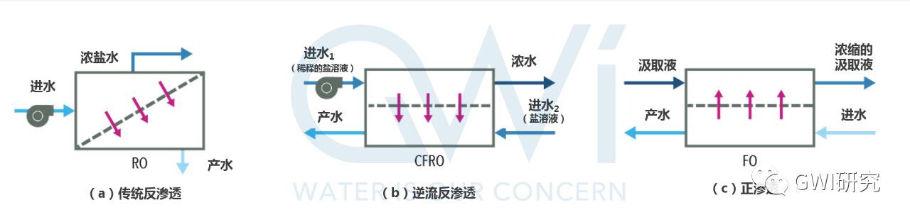 這些技術所使用的系統配置通常包括鹽水預處理技術水處理設備、定制膜過濾系統、新型膜清洗方案、新型排鹽水系統、高壓工況、循環泵、能量回收裝置等。一般來說,反滲透將鹽溶液濃度限制在較高倍數的主要原因是施加的壓力達到滲透壓力的極限,使系統無法進一步濃縮鹽水。針對這一挑戰,目前有兩個頗具前景的新興技術,可將鹽水濃縮至高于高壓反滲透的濃度水平: